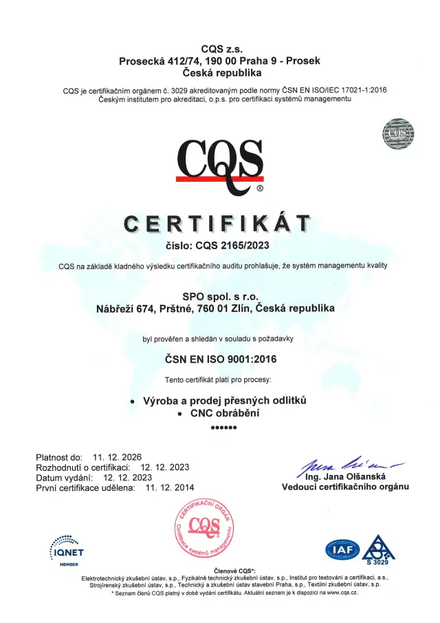 Notre entreprise accorde une importance primordiale à la qualité, au respect des délais et à la satisfaction des clients. Chaque année, nous vérifions également la conformité aux exigences de la norme ČSN EN ISO 9001:2016 afin de soutenir la gestion des processus dans la fonderie.